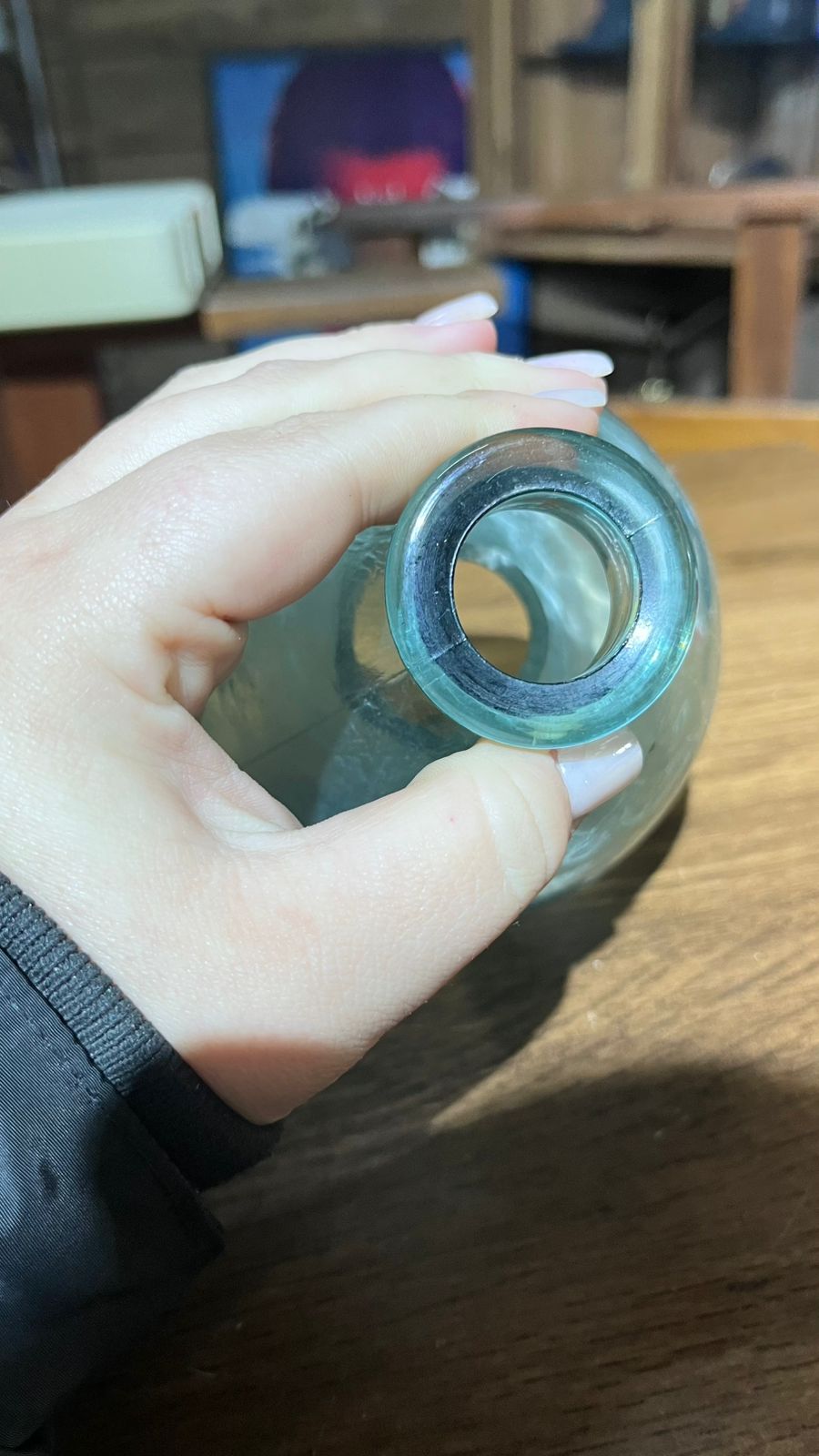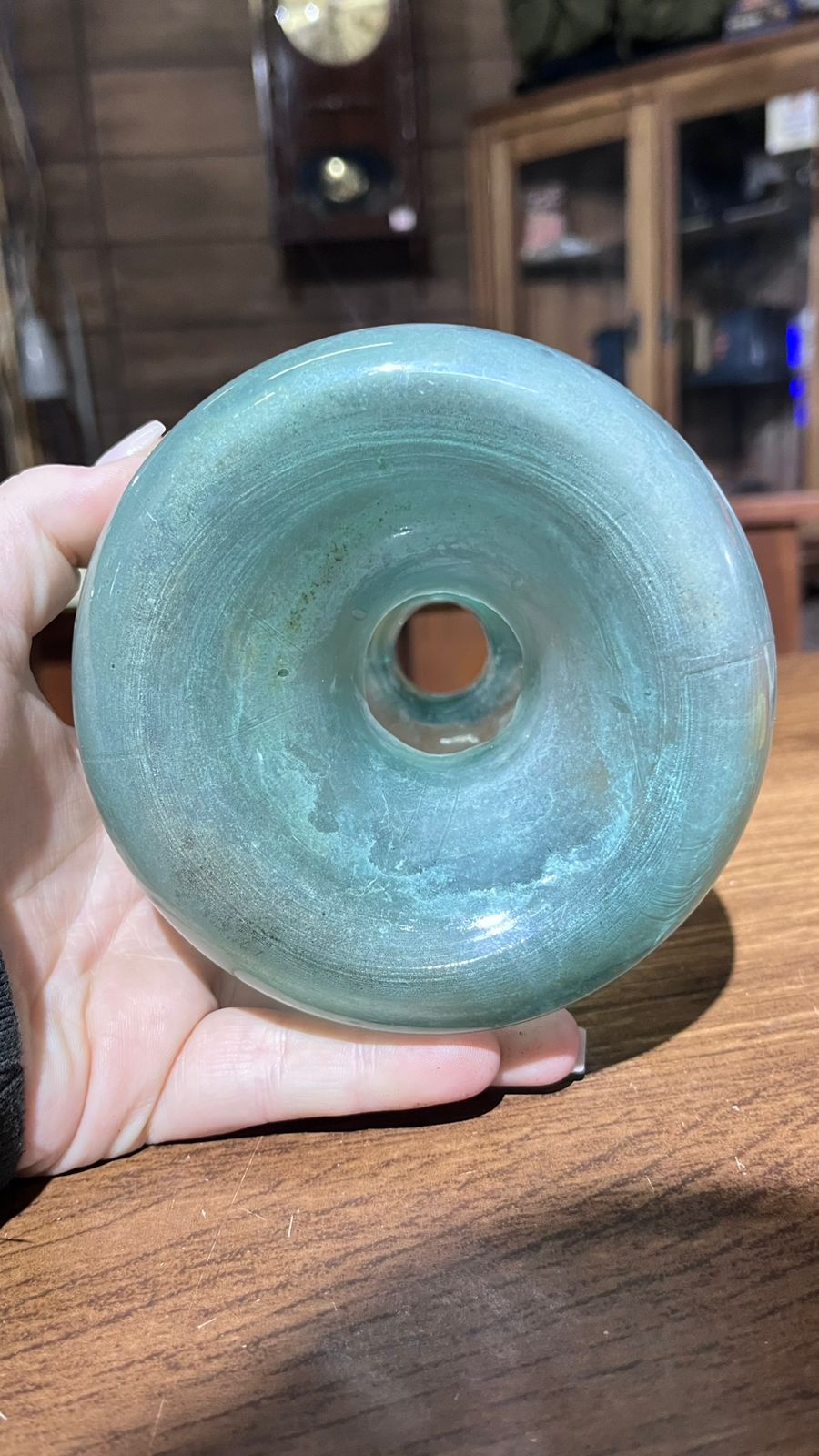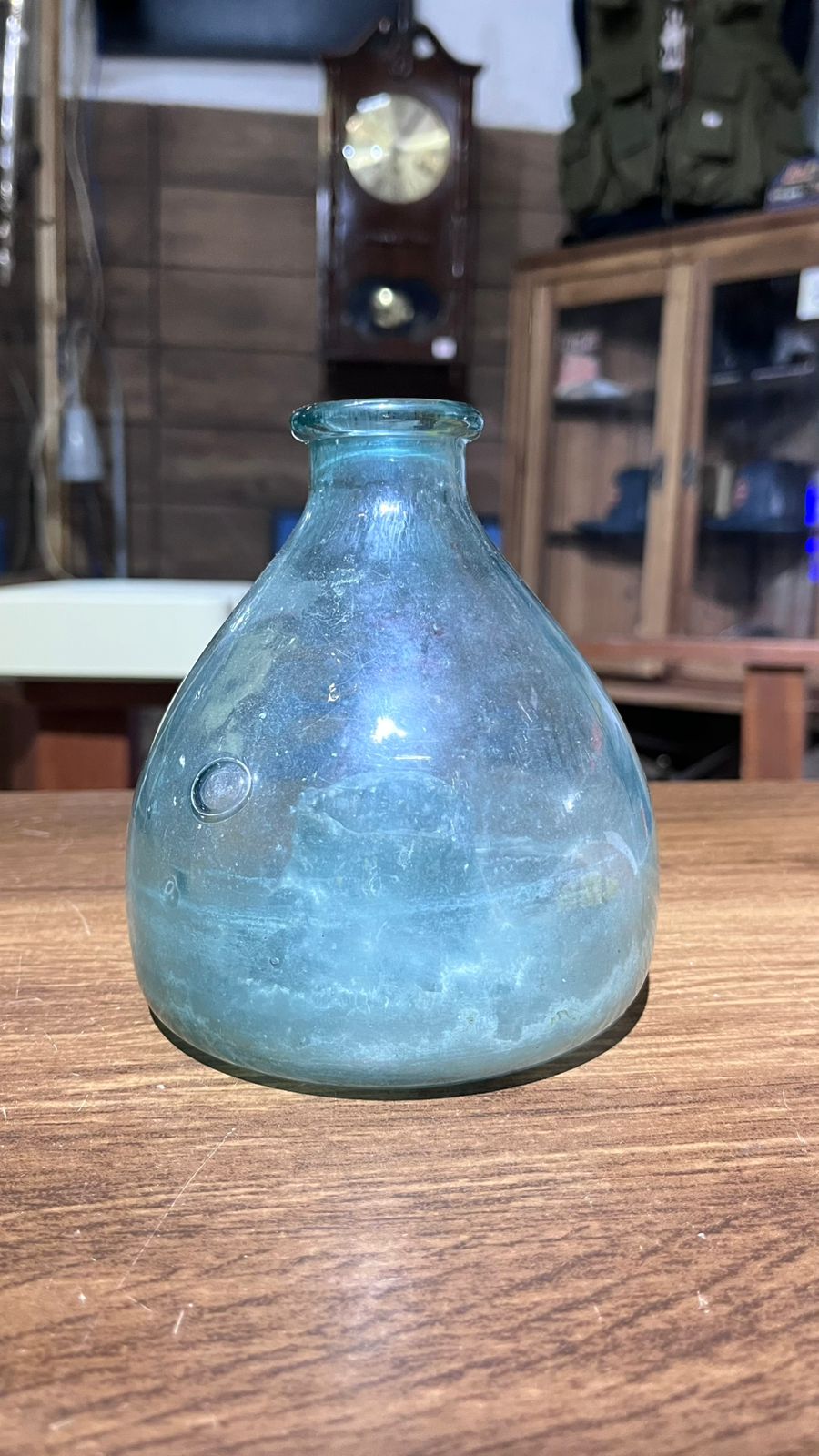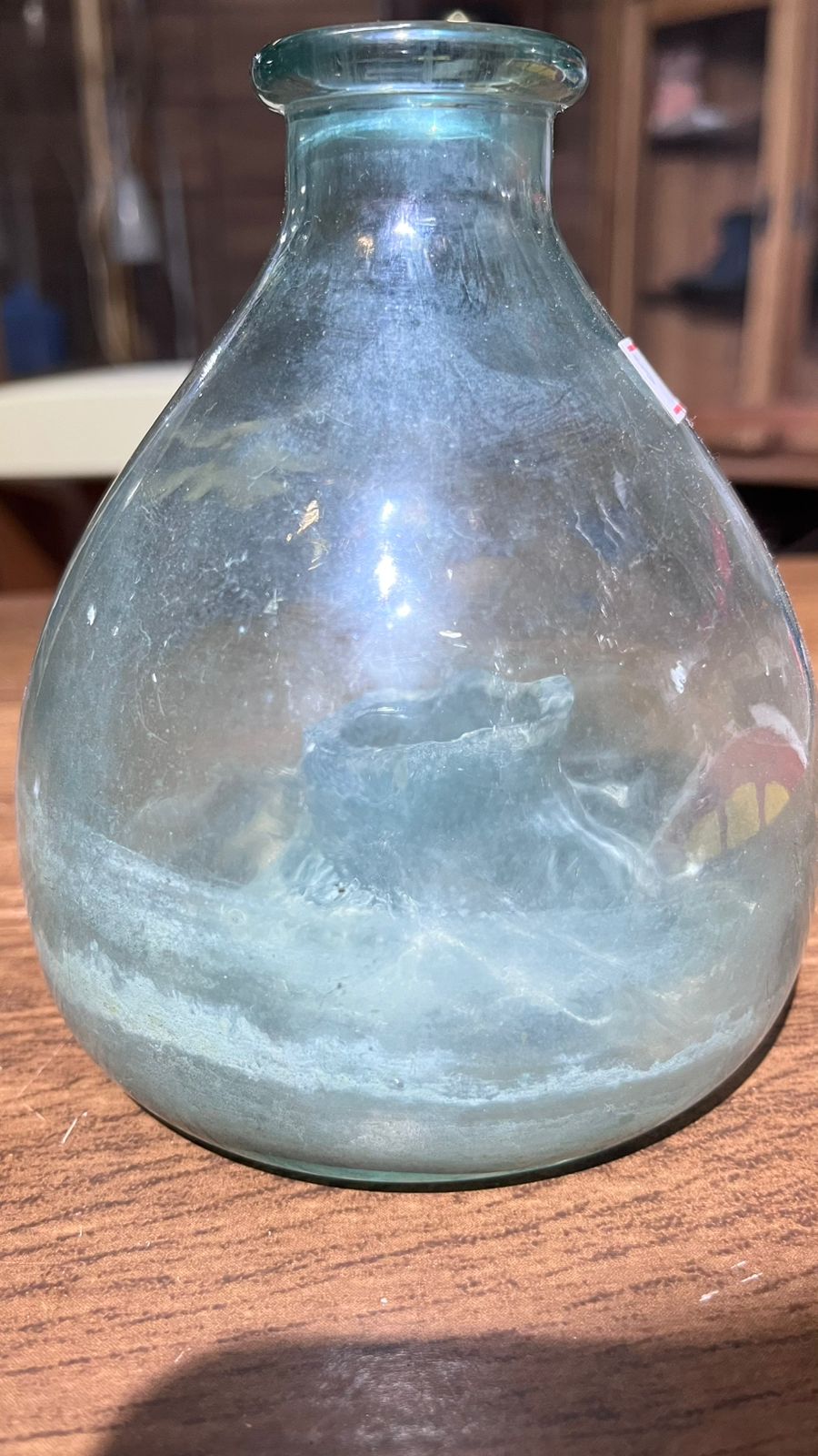 A peça é de vidro e está conforme nas fotos, com marcas de uso e do tempo.